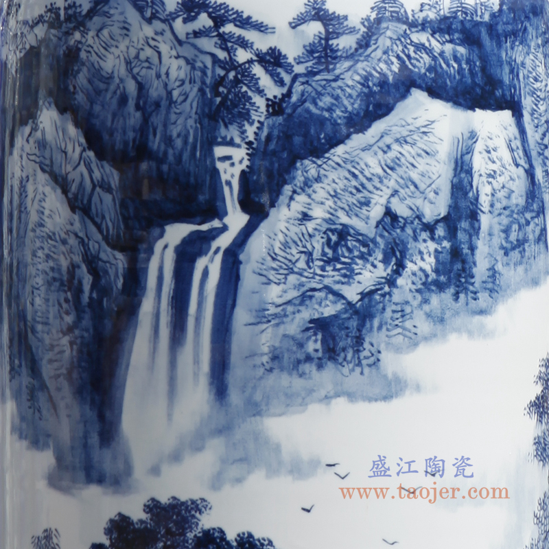 产品介绍:青花瓷(blue and white po rcelain),又称白地青花瓷,常简称青花,是中国瓷器的主流品种之一,属釉下彩瓷。青花瓷是用含氧化钴的钴矿为原料,在陶瓷坯体上描绘纹饰,再罩上一层透明釉,经1300℃左右高温还原焰烧制而成。钴料烧成后呈蓝色,具有着色力强、发色鲜艳、烧成率高、呈色稳定的特点。汉族劳动人民制作瓷器的历史悠久,品种繁多。原始青花瓷于唐宋已见端倪,成熟的青花瓷则出现在元代景德镇的湖田窑。明代青花成为瓷器的主流。清康熙时发展到了顶峰。景德镇青花瓷以其烧造精致而独占熬头,造型优美,色彩绚丽,装饰精美,是景德镇四大传统名瓷之一,它无铅无毒,耐酸耐磨,面色经久不退,素有“永不凋谢的青花”之称。 本品坯胎全手工拉坯制作,釉面和青花料采用高档仿清颜料。瓶身山水风景图团花簇拥,构图优美,瓶颈花卉、圈足纹图和瓶身山水风景图交相辉映,相得益彰,层次清晰,瓷质温和细腻,釉色古朴清丽,晶莹丰润,清新养目,极具古意,具有较高的艺术欣赏和实用价值。