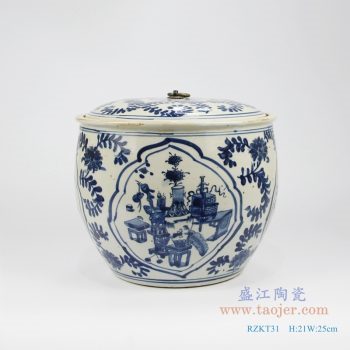青花瓷(blue and white porcelain),又称白地青花瓷,常简称青花,是中国瓷器的主流品种之一,属釉下彩瓷。青花瓷是用含氧化钴的钴矿为原料,在陶瓷坯体上描绘纹饰,再罩上一层透明釉,经1300℃左右高温还原焰烧制而成。钴料烧成后呈蓝色,具有着色力强、发色鲜艳、烧成率高、呈色稳定的特点。汉族劳动人民制作瓷器的历史悠久,品种繁多。原始青花瓷于唐宋已见端倪,成熟的青花瓷则出现在元代景德镇的湖田窑。明代青花成为瓷器的主流。清康熙时发展到了顶峰。景德镇青花瓷以其烧造精致而独占熬头,造型优美,色彩绚丽,装饰精美,是景德镇四大传统名瓷之一,它无铅无毒,耐酸耐磨,面色经久不退,素有“永不凋谢的青花”之称。 本品坯胎全手工拉坯制作,釉面和青花料采用高档仿清颜料。瓶身山水风景图团花簇拥,构图优美,瓶颈花卉、圈足纹图和瓶身山水风景图交相辉映,相得益彰,层次清晰,瓷质温和细腻,釉色古朴清丽,晶莹丰润,清新养目,极具古意,具有较高的艺术欣赏和实用价值。
