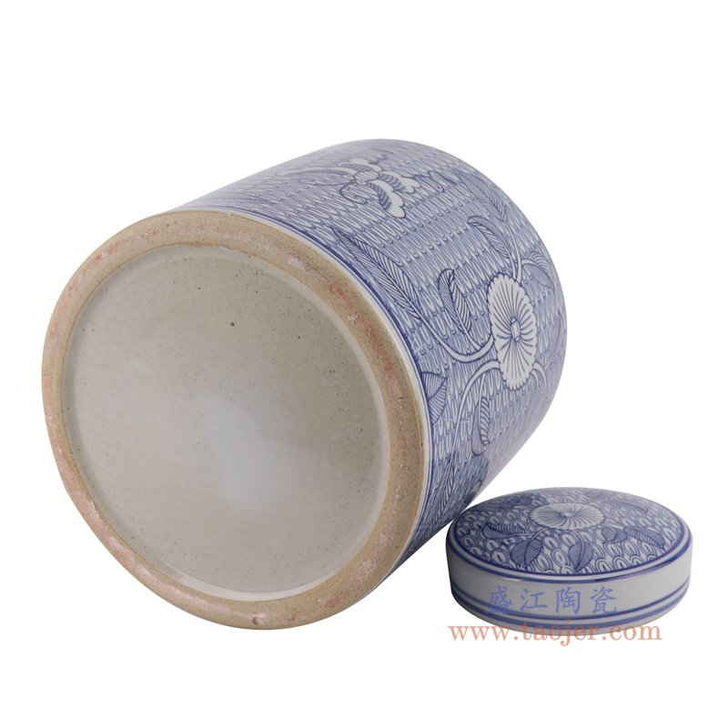 青花太阳花蝴蝶铜钱纹直筒茶叶罐,产品编号:RZSI33 产品尺寸(单位cm): 高28.7直径22.3口径底径重量3.4KG