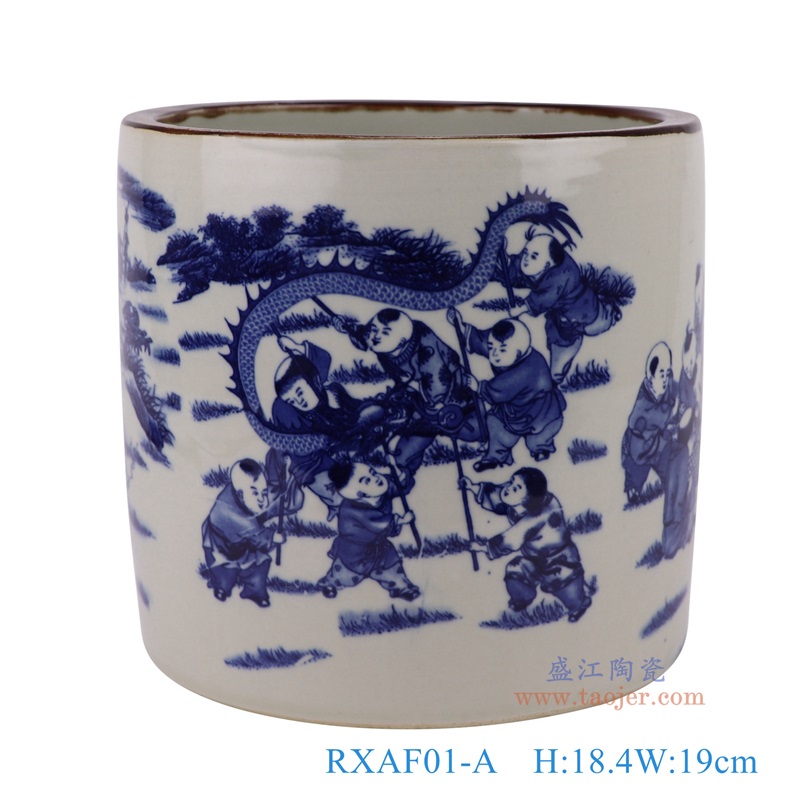 青花人物婴戏图笔筒,产品编号:RXAF01-A 产品尺寸(单位cm): 高18.4直径19口径底径重量2.2KG