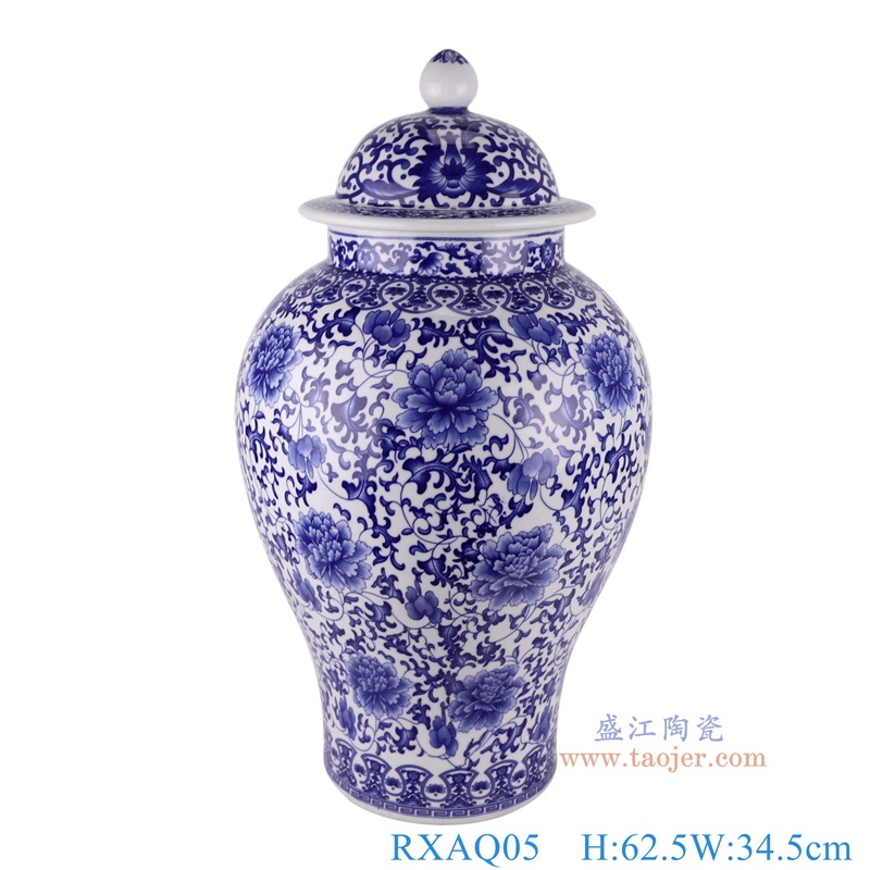 青花缠枝莲将军罐大号,产品编号:RXAQ05 产品尺寸(单位cm): 高62.5直径34.5口径底径21重量8KG