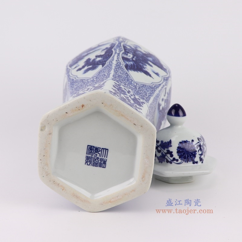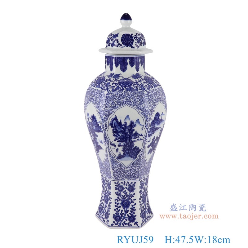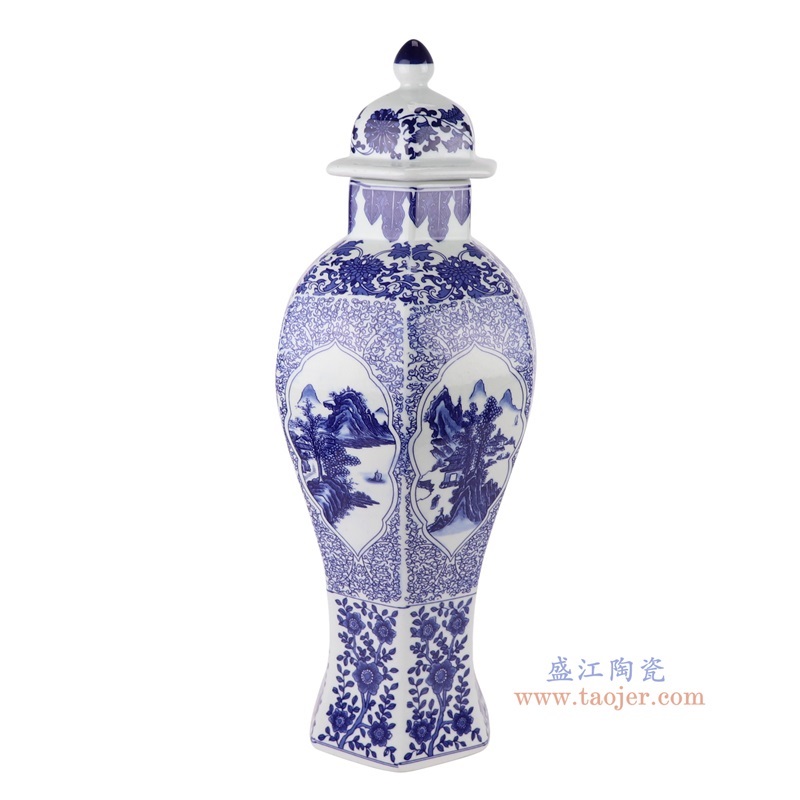 青花瓷(blue and white porcelain),又称白地青花瓷,常简称青花,是中国瓷器的主流品种之一,属釉下彩瓷。青花瓷是用含氧化钴的钴矿为原料,在陶瓷坯体上描绘纹饰,再罩上一层透明釉,经1300℃左右高温还原焰烧制而成。钴料烧成后呈蓝色,具有着色力强、发色鲜艳、烧成率高、呈色稳定的特点。汉族劳动人民制作瓷器的历史悠久,品种繁多。原始青花瓷于唐宋已见端倪,成熟的青花瓷则出现在元代景德镇的湖田窑。明代青花成为瓷器的主流。清康熙时发展到了顶峰。景德镇青花瓷以其烧造精致而独占熬头,造型优美,色彩绚丽,装饰精美,是景德镇四大传统名瓷之一,它无铅无毒,耐酸耐磨,面色经久不退,素有“永不凋谢的青花”之称。 本品坯胎全手工拉坯制作,釉面和青花料采用高档仿清颜料。瓶身山水风景图团花簇拥,构图优美,瓶颈花卉、圈足纹图和瓶身山水风景图交相辉映,相得益彰,层次清晰,瓷质温和细腻,釉色古朴清丽,晶莹丰润,清新养目,极具古意,具有较高的艺术欣赏和实用价值。