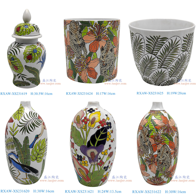 Next: RXAW-XS231626-zuhe 白底彩绘老虎纹花盆 黄底彩绘黄鸟纹坛罐子 白底彩绘绿叶纹胆瓶 浅蓝底彩绘袋鼠纹方口瓶 浅蓝底彩绘带竖纹尖嘴瓶 白底彩绘花鸟扁肚罐