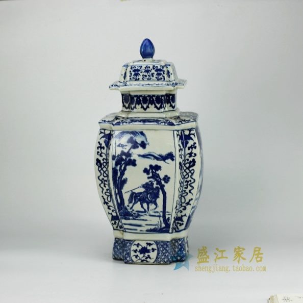 Next: RYJF38-OLD青花六棱风景人物屏画瓷罐 盖罐 储物罐 尺寸: 口径 9厘米 肚径 22厘米 高 46.8厘米