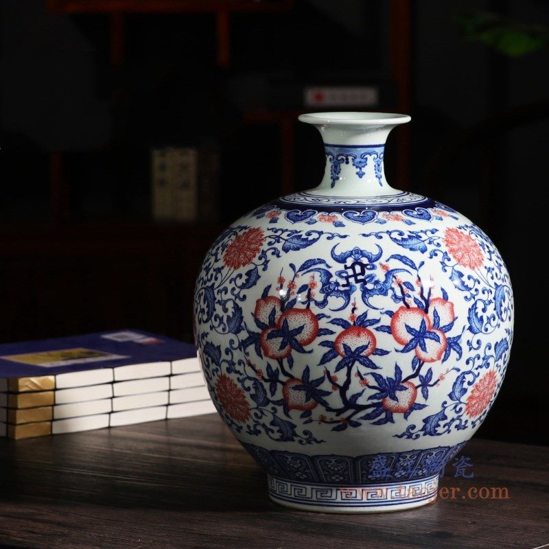 产品介绍:青花瓷(blue and white porcelain),又称白地青花瓷,常简称青花,是中国瓷器的主流品种之一,属釉下彩瓷。青花瓷是用含氧化钴的钴矿为原料,在陶瓷坯体上描绘纹饰,再罩上一层透明釉,经1300℃左右高温还原焰烧制而成。钴料烧成后呈蓝色,具有着色力强、发色鲜艳、烧成率高、呈色稳定的特点。汉族劳动人民制作瓷器的历史悠久,品种繁多。原始青花瓷于唐宋已见端倪,成熟的青花瓷则出现在元代景德镇的湖田窑。明代青花成为瓷器的主流。清康熙时发展到了顶峰。景德镇青花瓷以其烧造精致而独占熬头,造型优美,色彩绚丽,装饰精美,是景德镇四大传统名瓷之一,它无铅无毒,耐酸耐磨,面色经久不退,素有“永不凋谢的青花”之称。 本品坯胎全手工拉坯制作,釉面和青花料采用高档仿清颜料。瓶身山水风景图团花簇拥,构图优美,瓶颈花卉、圈足纹图和瓶身山水风景图交相辉映,相得益彰,层次清晰,瓷质温和细腻,釉色古朴清丽,晶莹丰润,清新养目,极具古意,具有较高的艺术欣赏和实用价值。