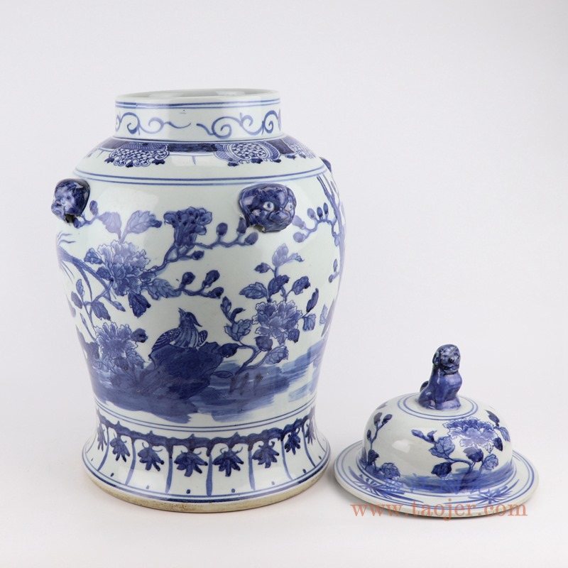 青花花鸟狮子头将军罐;产品编号:RZSC28       产品尺寸(单位cm):  高:53直径:32口径:底径:26.5重量:9.5KG