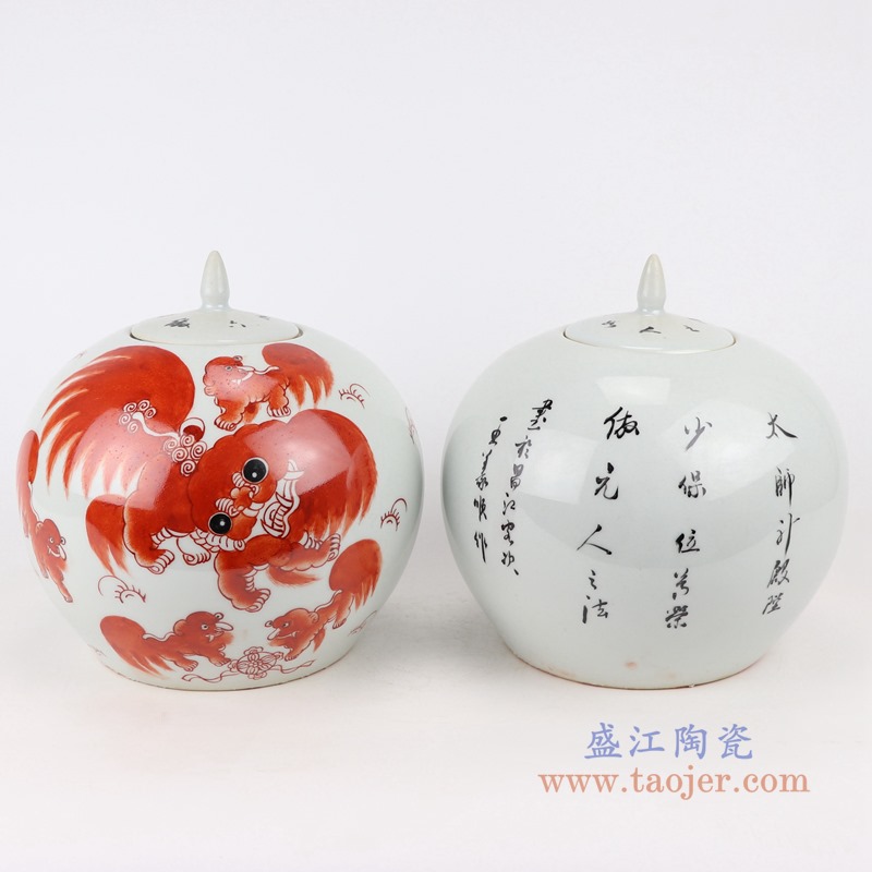 矾红狮子纹西瓜罐尖盖罐一对;产品编号:RZIH19 产品尺寸(单位cm): 高:21.5直径:22.2口径:9.2底径:14.7重量:1.6KG