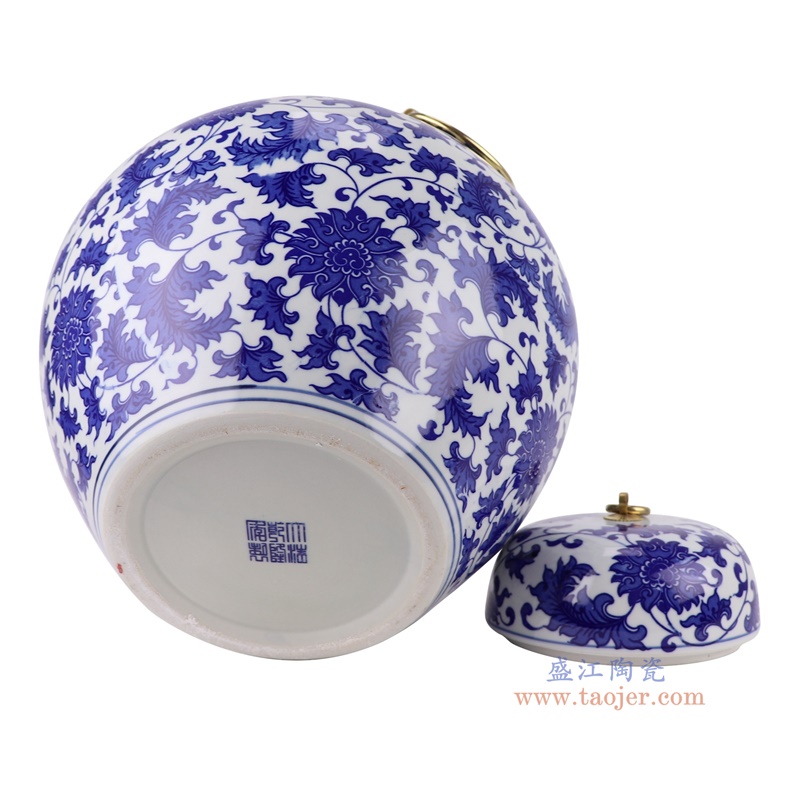 青花缠枝莲带铜环提手宝珠坛,产品编号:RZTY05-A 产品尺寸(单位cm): 高31直径28.6口径15.2底径15重量3.45KG
