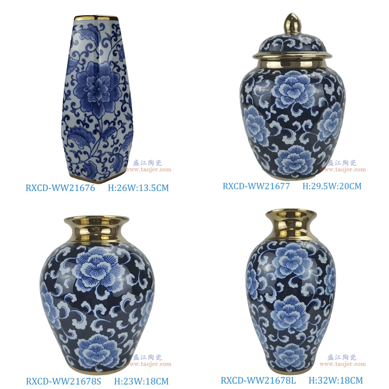 RXCD-WW21676青花缠枝莲纹花瓶 RXCD-WW21677手工描金牡丹纹将军罐 RXCD-WW21678S手工描金牡丹纹冬瓜瓶 RXCD-WW21678L手工描金牡丹纹冬瓜瓶大号