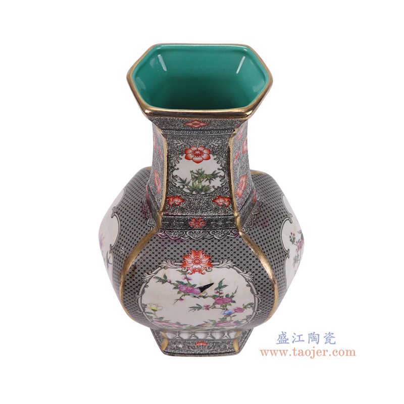 RYRJ37-A-S 珐琅彩灰底开窗花鸟六角花瓶小号 高31直径18.2底径10.3重量1.45KG